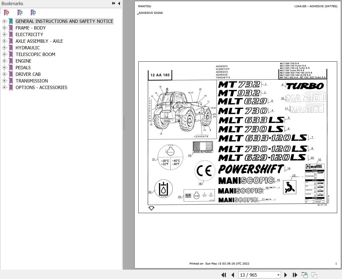 The Bookmarks Of Manitou MLT 633 120 LS SA Telescopic Handler Parts Catalog:
