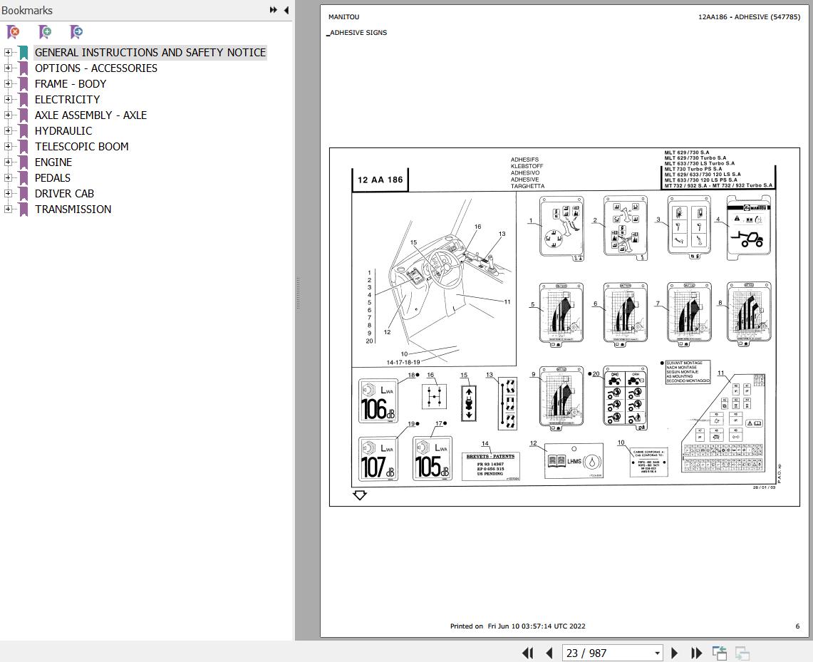 The Bookmarks Of Manitou MLT 633 LS TURBO SA Telescopic Handler Parts Catalog: