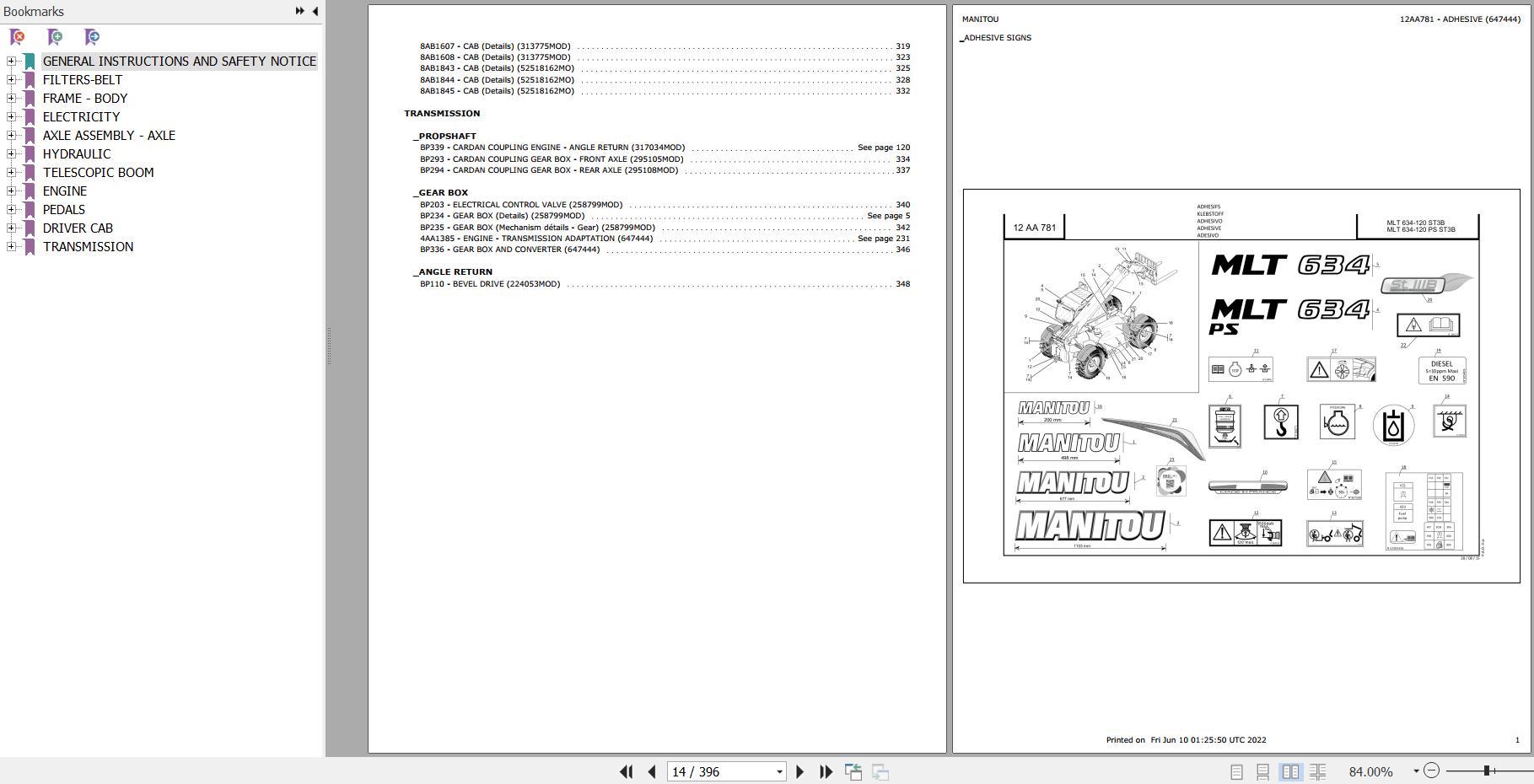 The Bookmarks Of Manitou MLT 634 120 ST3B Telescopic Handler Parts Catalog: