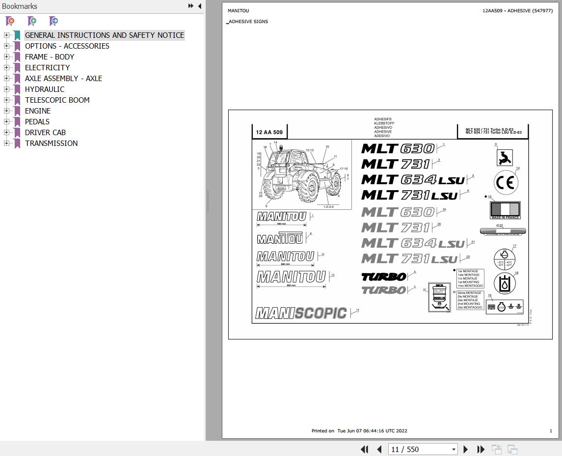 The Bookmarks Of Manitou MLT 731 TURBO LSU SD E3 Telescopic Handler Parts Catalog: