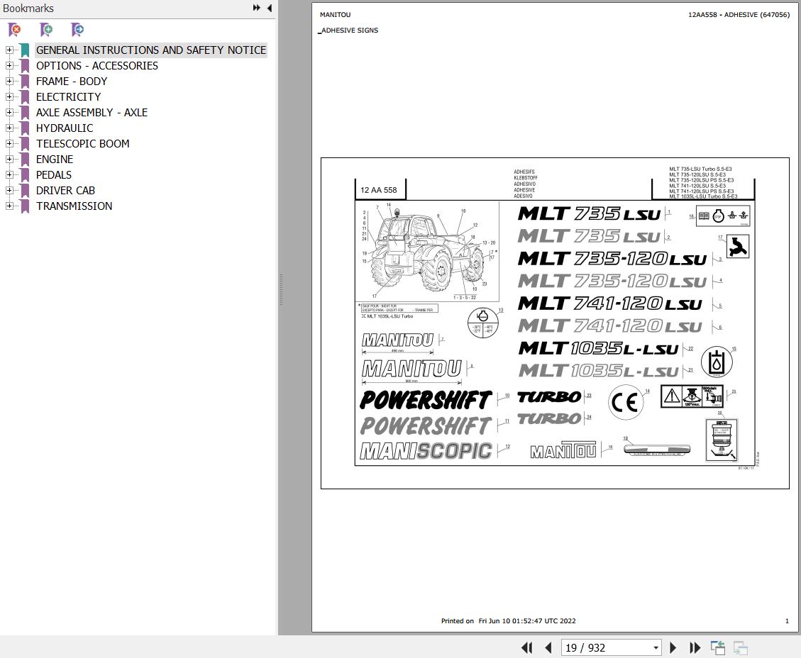The Bookmarks Of Manitou MLT 735 120 LSU S5 E3 Telescopic Handler Parts Catalog: