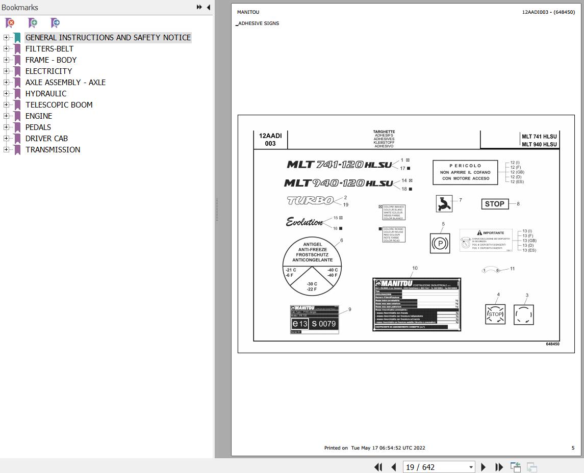 The Bookmarks Of Manitou MLT 741 H LSU TUV E3 Telescopic Handler Parts Catalog: