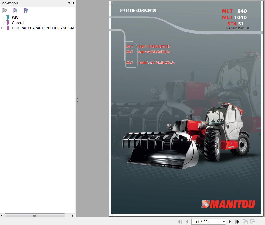 Manitou MLT 840 115 PS JD ST4 S1 MLT 840 137 PS JD ST4 S1 MLT 1040 137 PS JD ST4 S1 Repair Manual 647541