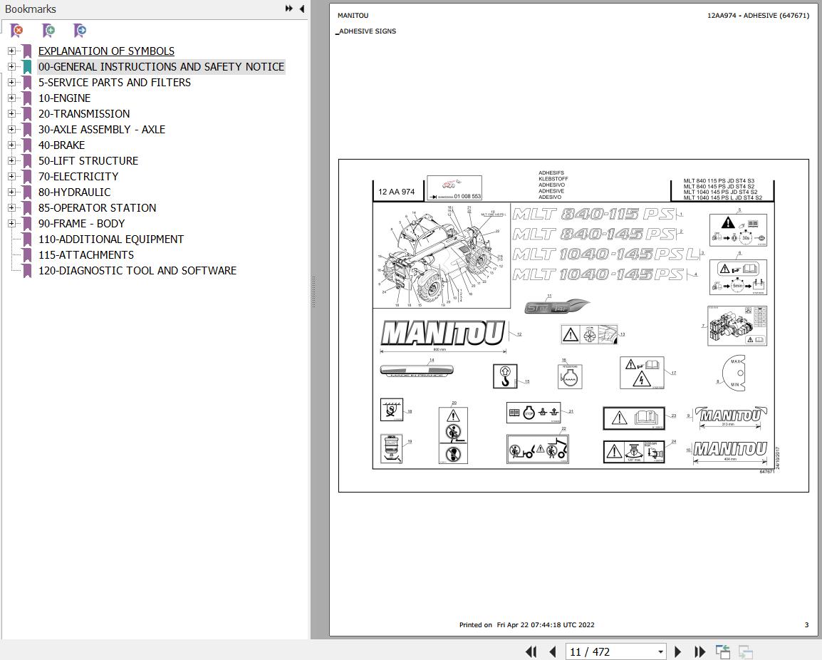 The Bookmarks Of Manitou MLT 840 145 PS JD ST4 S2 Telescopic Handler Parts Catalog:
