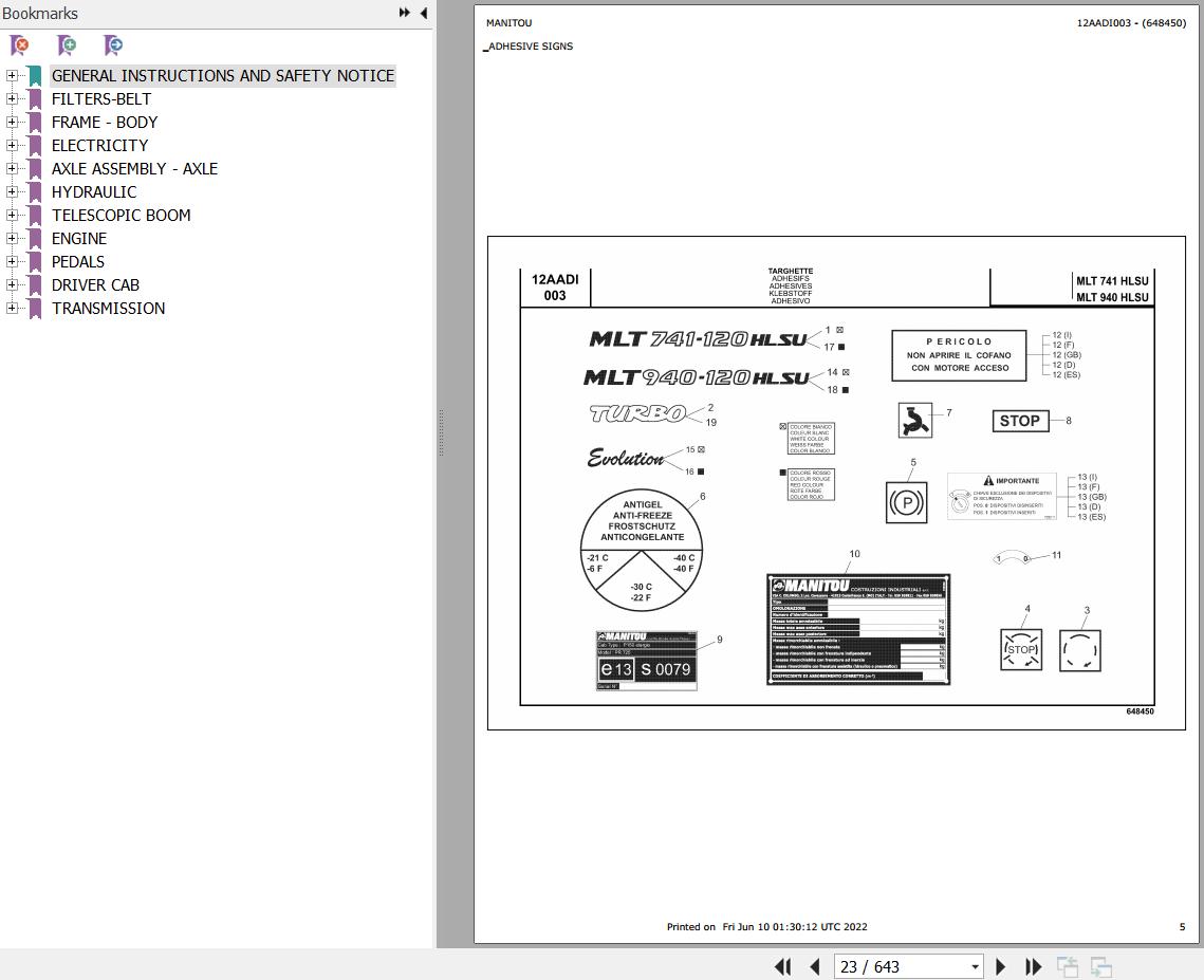 The Bookmarks Of Manitou MLT 940 H LSU TUV E3 Telescopic Handler Parts Catalog: