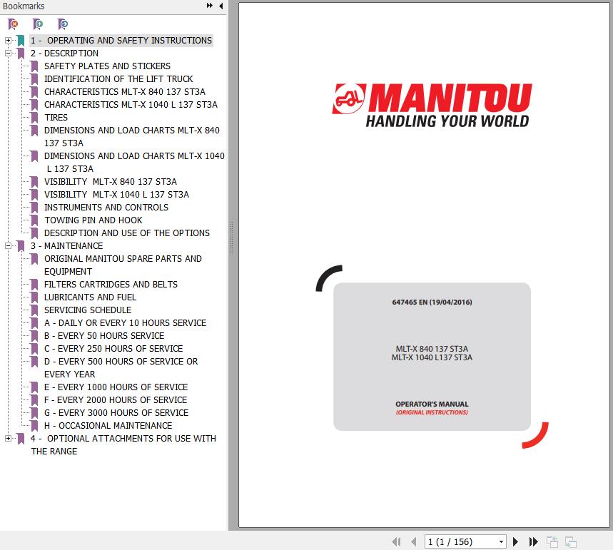 The Bookmarks of Manitou MLT-X 840 137 ST3A MLT-X 1040 L137 ST3A Operator's Manual: