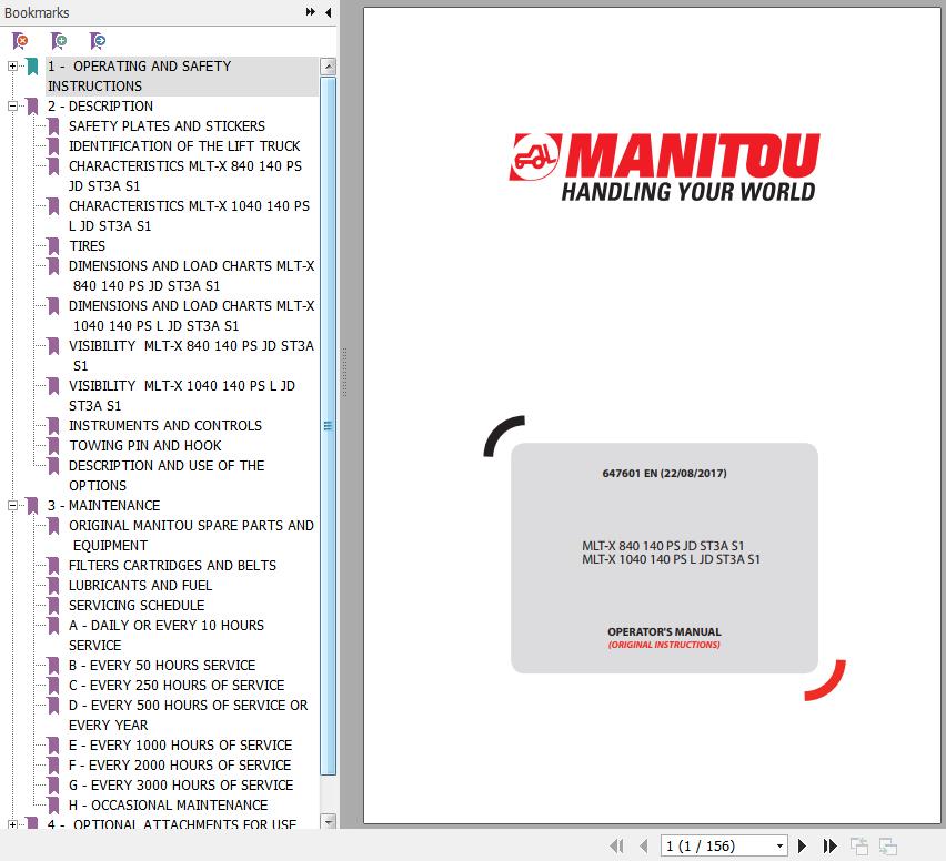 The Bookmarks of Manitou MLT-X 840 140 PS JD ST3A S1 MLT-X 1040 140 PS L JD ST3A S1 Operator's Manual: