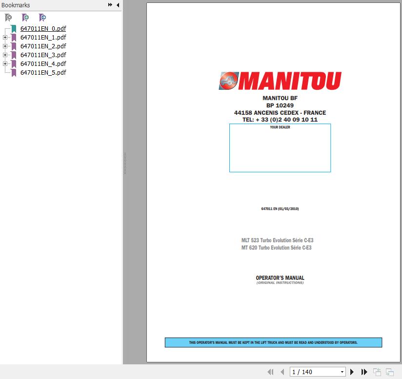 The Bookmarks of Manitou MLT 523 Turbo EVOLUTION C-E3 MT 620 Turbo EVOLUTION C-E3 Telescopic Handlers Operator's Manual: