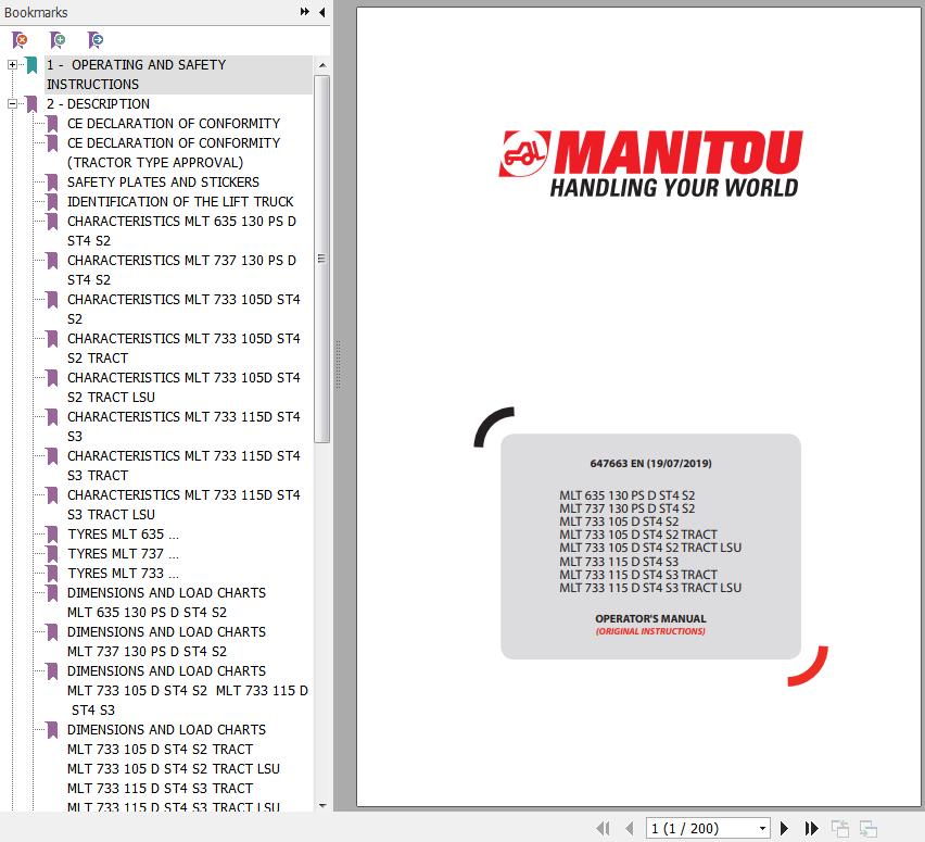 The Bookmarks of Manitou MLT 635 130 PS D ST4 S2 To MLT 733 115D ST4 S3 TRACT LSU Operator's Manual: