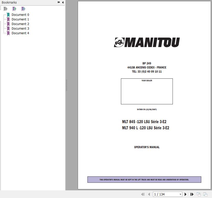 The Bookmarks of Manitou MLT 845 120 LSU Series 3-E2 MLT 940 L 120 LSU Series 3-E2 Operator's Manual: