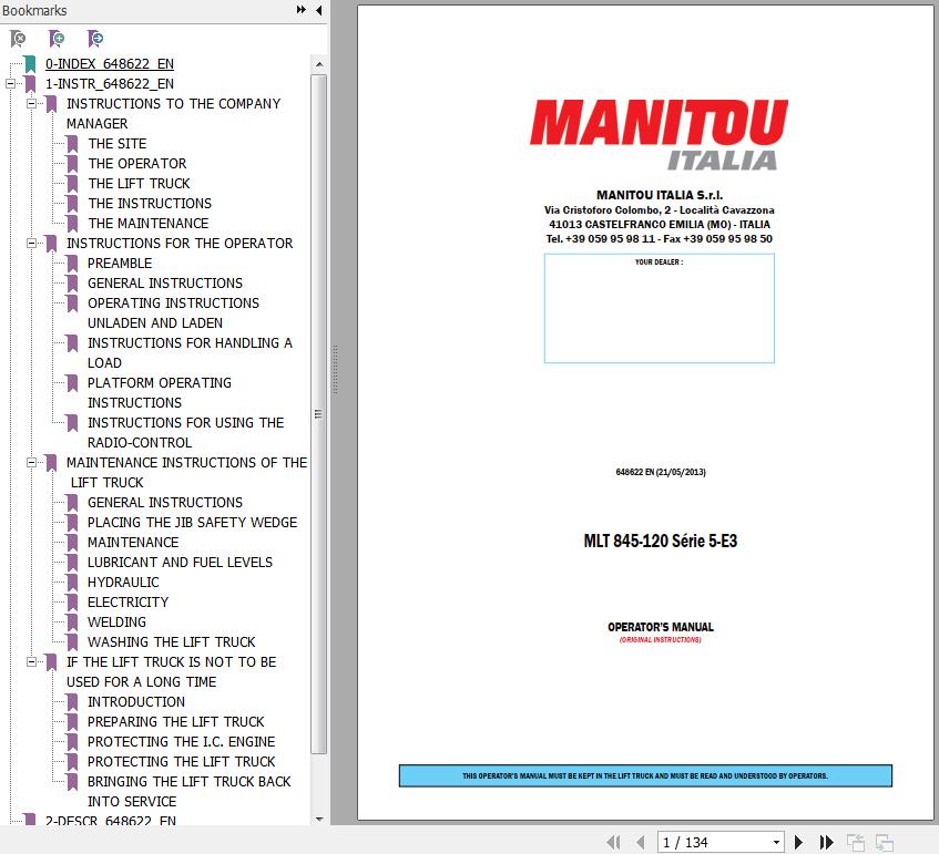 The Bookmarks of Manitou MLT 845 120 Series 5-E3 Telescopic Handlers Operator's Manual: