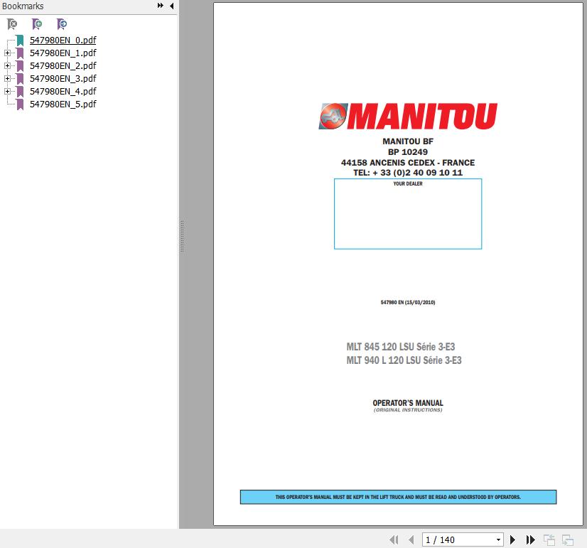 The Bookmarks of Manitou MLT 845 120 LSU Series 3-E3 MLT 940 L 120 LSU Series 3-E3 Operator's Manual: