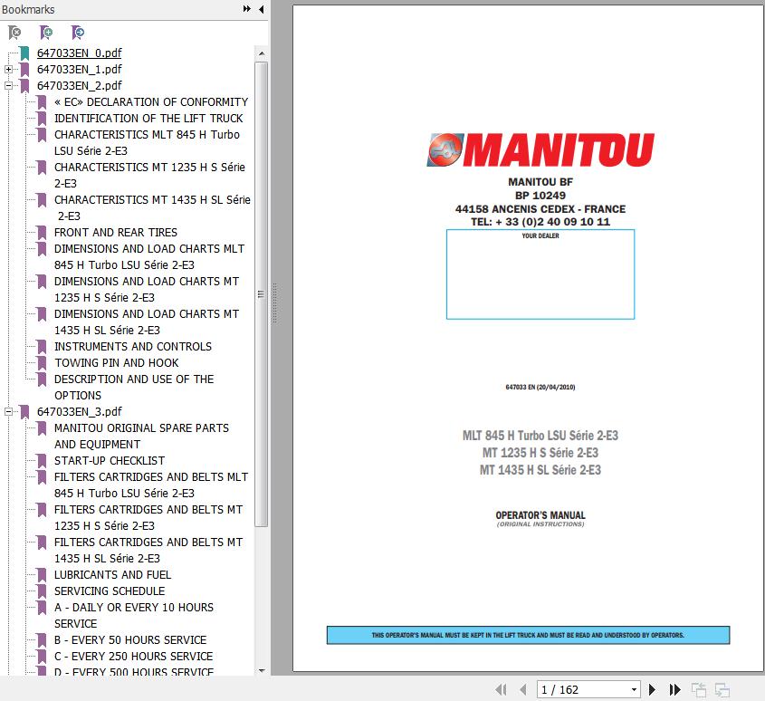 The Bookmarks of Manitou MLT 845 H Turbo LSU Series 2-E3 MT 1235 H S Series 2-E3 MT 1435 H SL Series 2-E3 Operator's Manual: