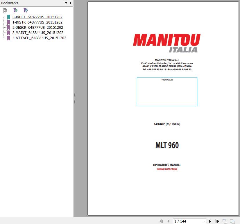 The Bookmarks of Manitou MLT 960 Telescopic Handlers Operator's Manual: