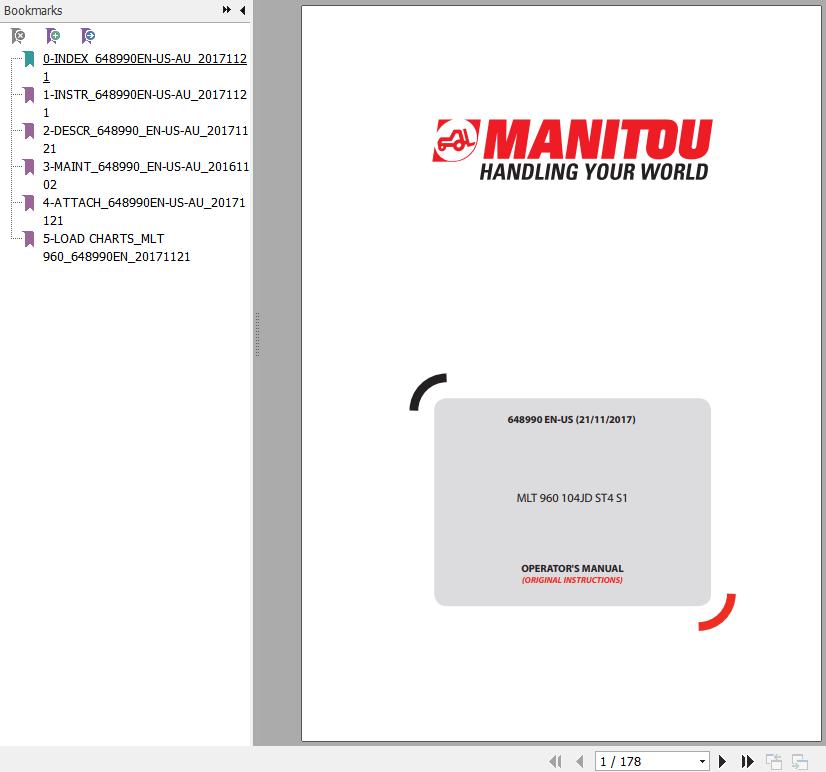 The Bookmarks of Manitou MLT960104JMLT 960 104JD H ST4 S1 DHST4S1 Telescopic Handlers Operator's Manual: