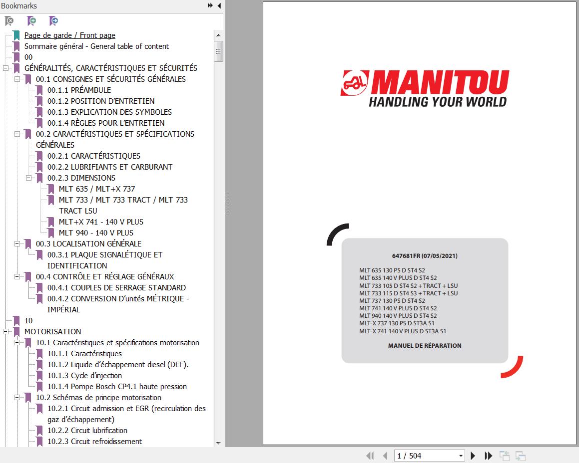 Manitou MLT(X) 635 733 737 741 940 105 130PS 140V PLUS D ST4 S2-3 ST3A S1 TRACT LSU Repair Manual 647681