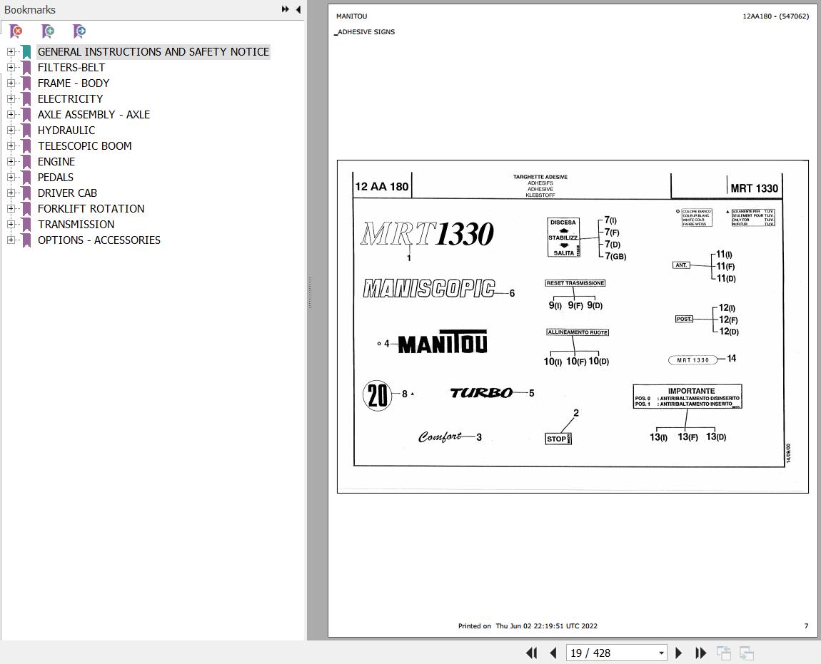 The Bookmarks Of Manitou MRT 1330 TURBO MOT 1004 4T Telescopic Handler Parts Catalog: