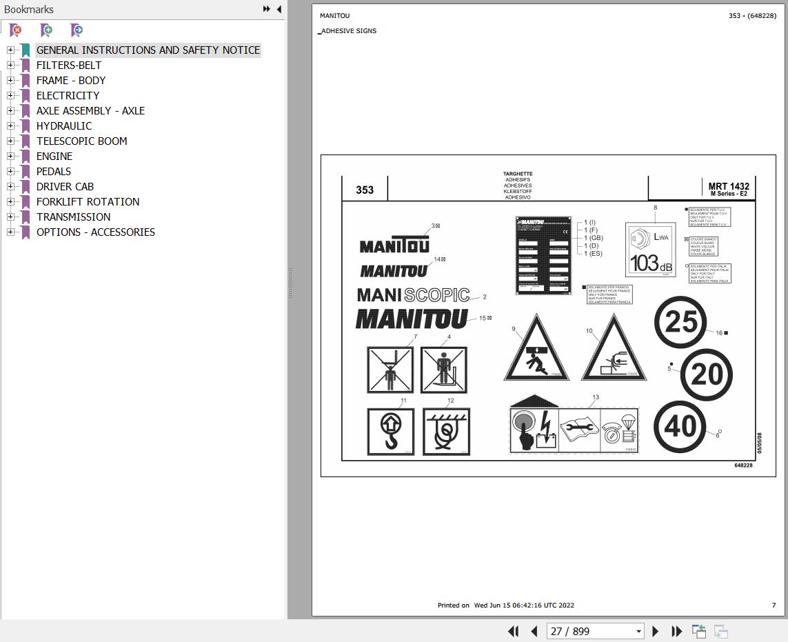 The Bookmarks Of Manitou MRT 1432 TURBO SERIE M 360 MOT 1104C 44T E2 Telescopic Handler Parts Catalog: