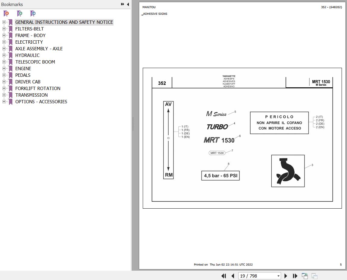 The Bookmarks Of Manitou MRT 1530 TURBO SERIE M 400 MOT 1004 40T Parts Catalog: