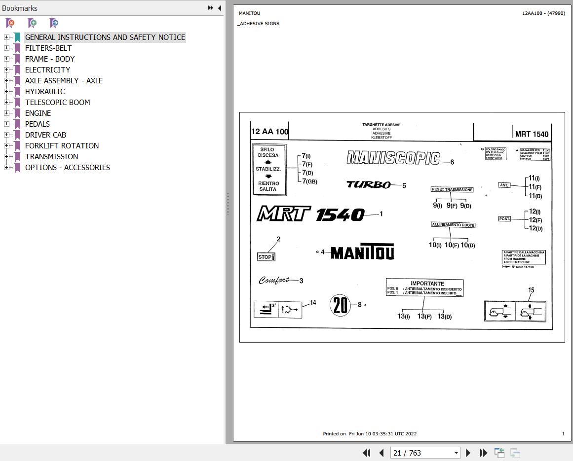 The Bookmarks Of Manitou MRT 1540 TURBO MOT 1004 4T Telescopic Handler Parts Catalog: