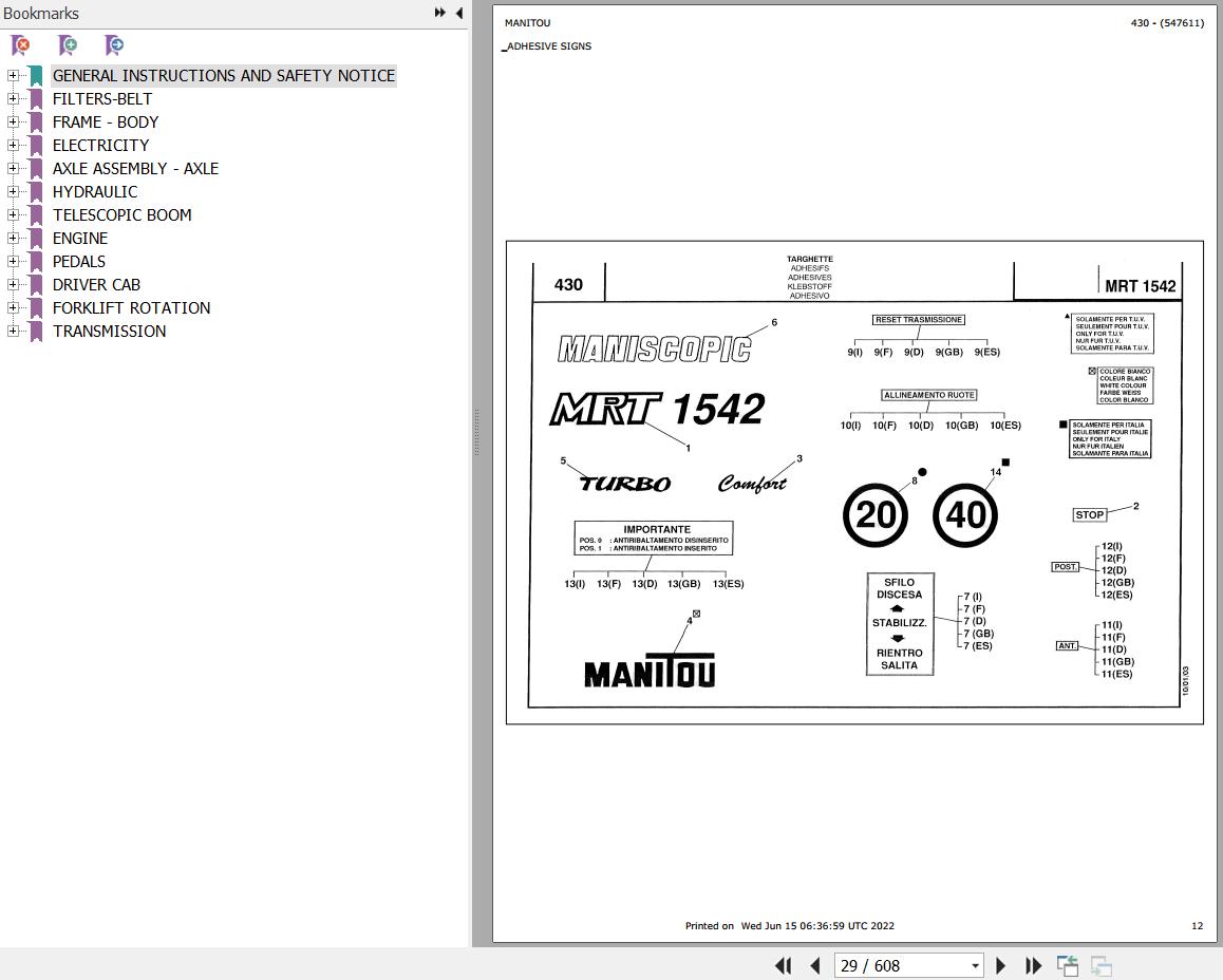 The Bookmarks Of Manitou MRT 1542 TURBO COMFORT LINE MOT 1004 40T Parts Catalog: