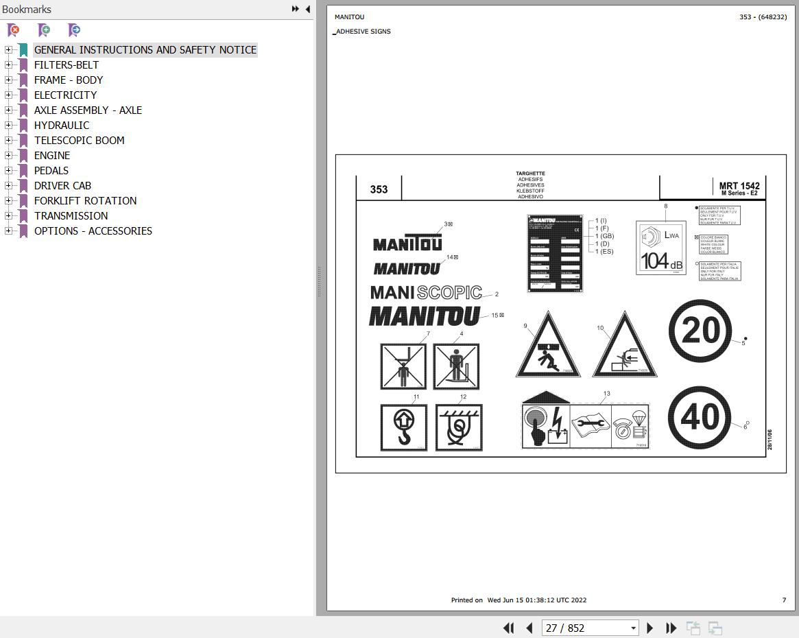 The Bookmarks Of Manitou MRT 1542 TURBO SERIE M 360 MOT 1104C 44T E2 Telescopic Handler Parts Catalog :