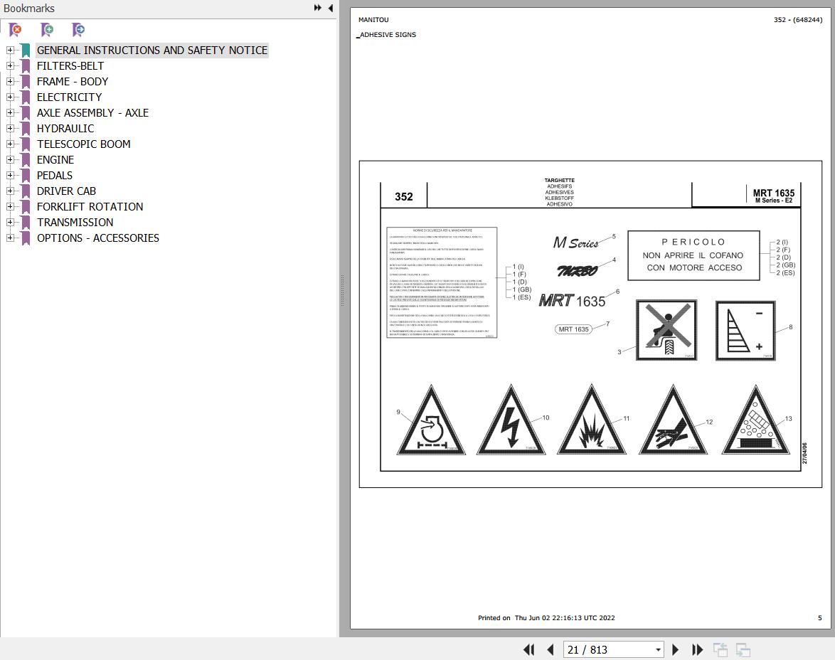 The Bookmarks Of Manitou MRT 1635 TURBO SERIE M 400 MOT 1104C 44T E2 Telescopic Handler Parts Catalog: