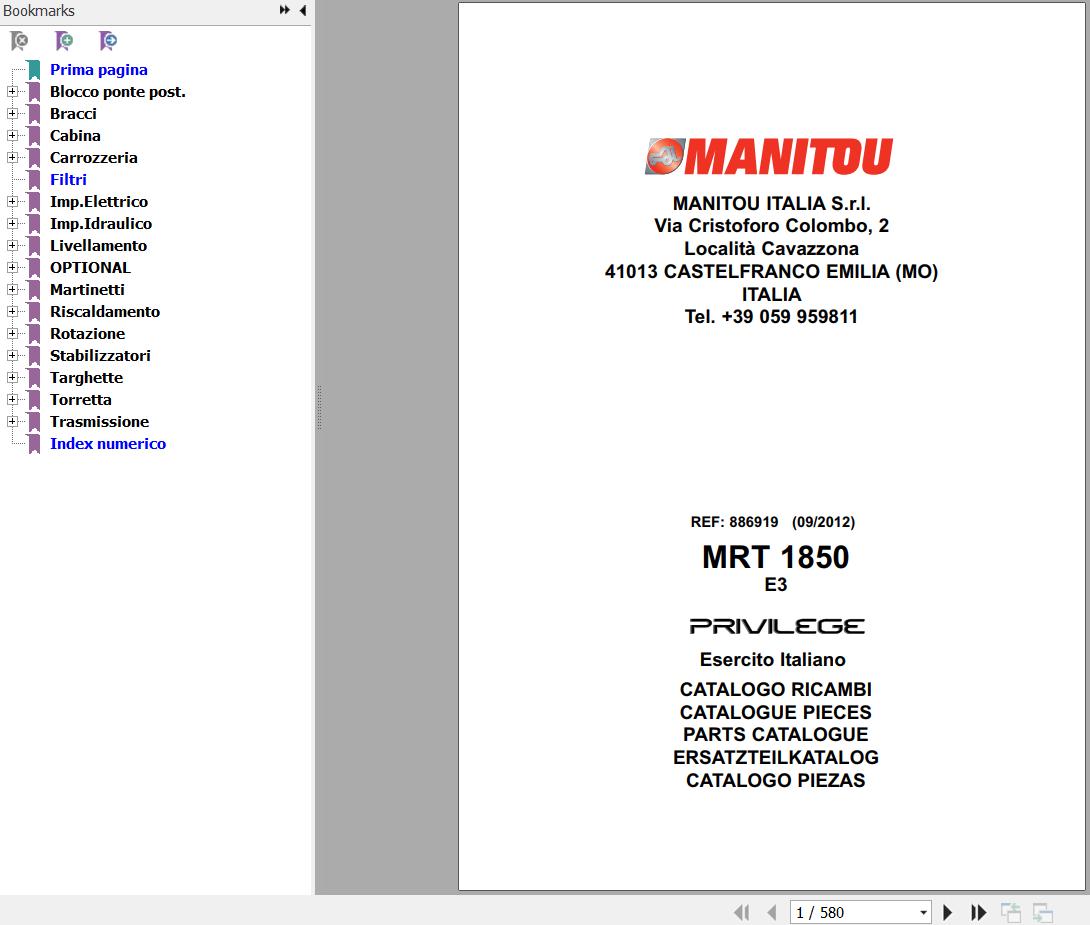 The Bookmarks Of Manitou MRT 1850 PRIVILEGE E3 ESERCITO ITALIANO Telescopic Handler Parts Catalog: