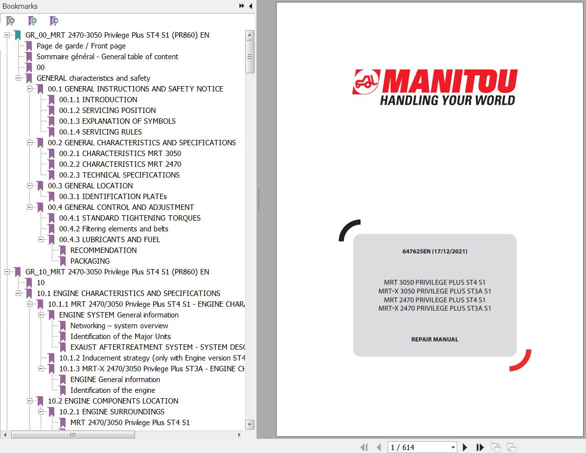 The Bookmarks Of Manitou MRT 2470 3050 PRIVILEGE PLUS ST4 S1 MRT-X 2470 3050 PRIVILEGE PLUS ST3A S1 Telescopic Handler Repair Manual: