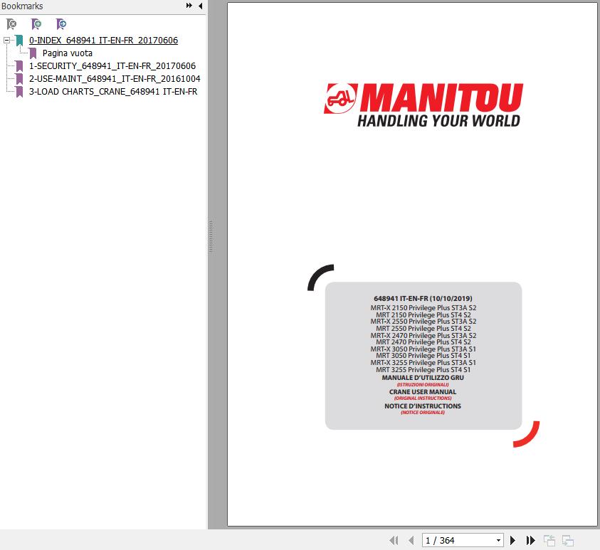 The Bookmarks of Manitou MRT-X2150 Privilege Plus ST3AS2 To MRT3255 Privilege Plus ST4S1 Telescopic Handlers User Manual: