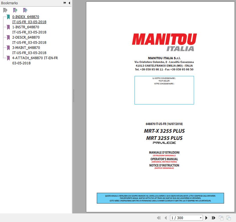 Manitou MRT-X 3255 Plus Privilege MRT 3255 Plus Privilege Operator's Manual 648870 IT US FR