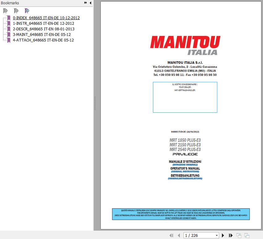 Manitou MRT 1850 PLUS E3 Privilege MRT 2150 PLUS E3 Privilege MRT 2540 PLUS E3 Privilege Operator's Manual 648665 IT EN DE