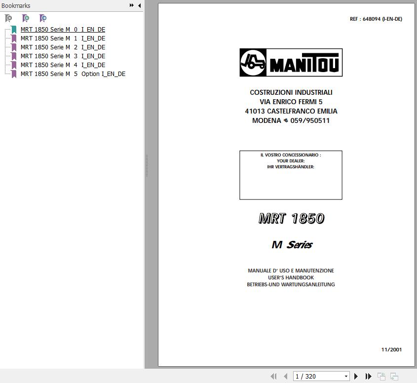 The Bookmarks of Manitou MRT 1850 M Series Telescopic Handlers Operator's Manual: