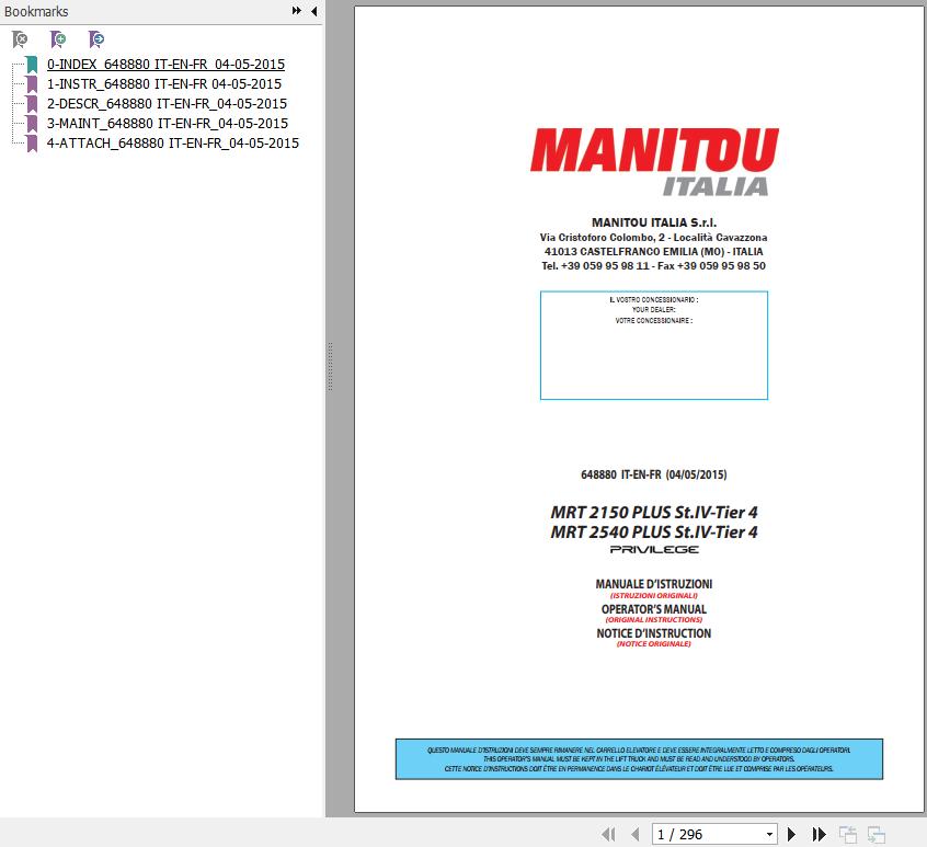 The Bookmarks of Manitou MRT 2150 PLUS St.IV-Tier 4 Privilege MRT 2540 PLUS St.IV-Tier 4 Privilege Telescopic Handlers Operator's Manual: