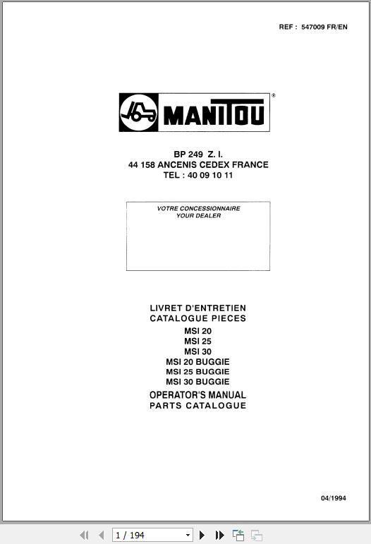 Manitou MSI 20 MSI 25 MSI 30 (BUGGIE) Operator's Manual & Parts Catalog 547009 FR