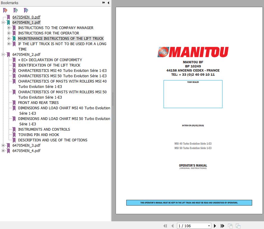 The Bookmarks of Manitou MSI 40 Turbo Evolution S1 E3 MSI 50 Turbo Evolution S1 E3 Telescopic Handlers Operator's Manual: