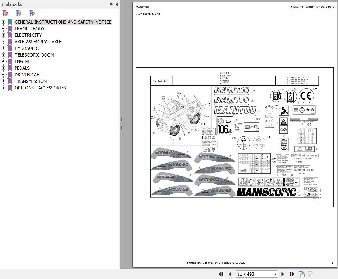 The Bookmarks Of Manitou MT 1044 EP PRIVILEGE Telescopic Handler Parts Catalog: