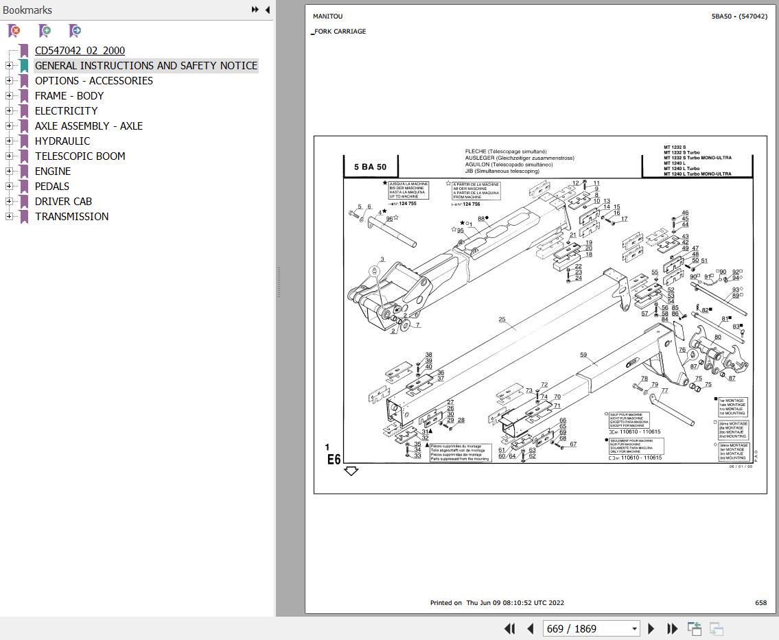 The Bookmarks Of Manitou MT 1232 S TURBO Telescopic Handler Parts Catalog: