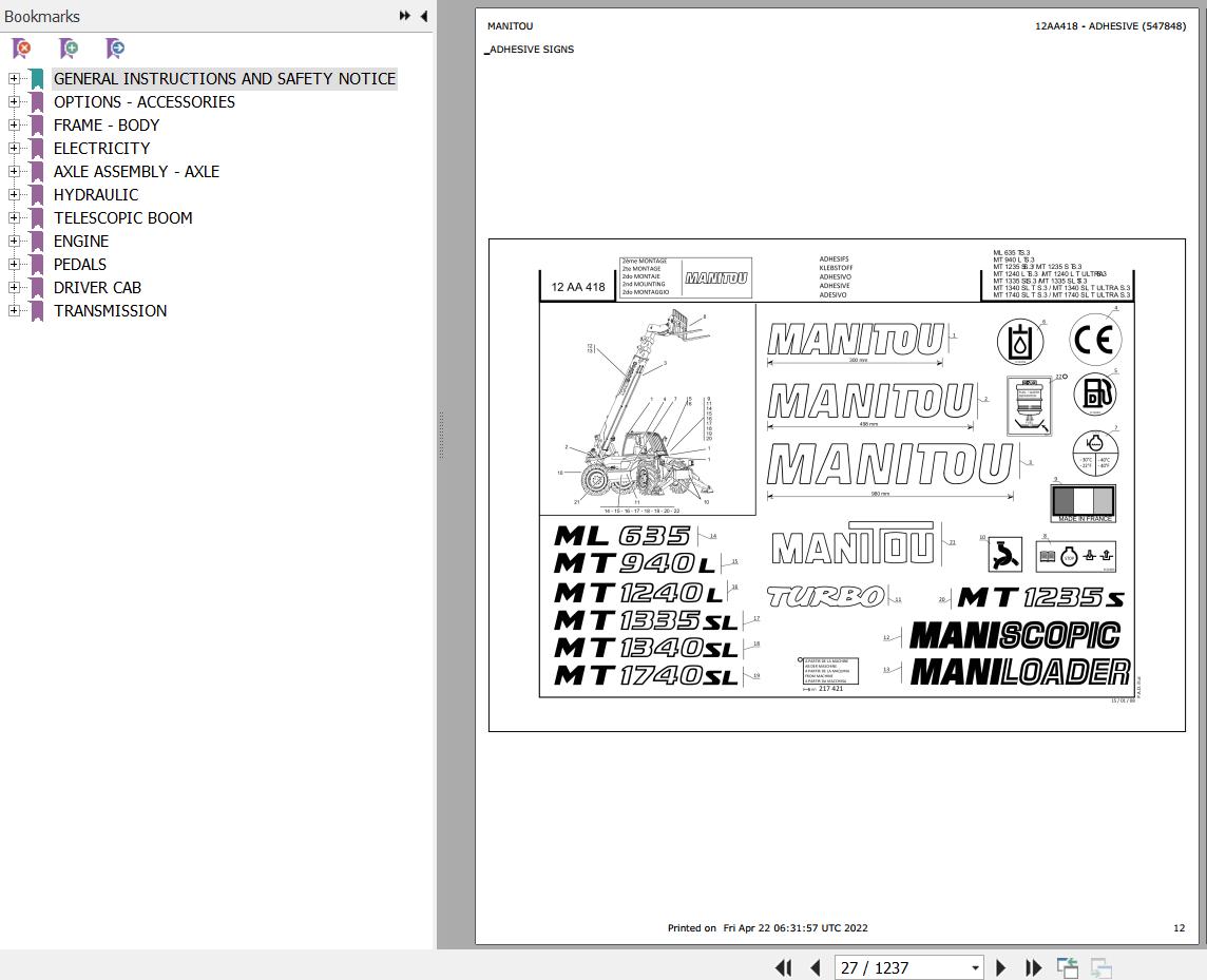 The Bookmarks Of Manitou MT 1235 S TURBO S3 E2 Telescopic Handler Parts Catalog: