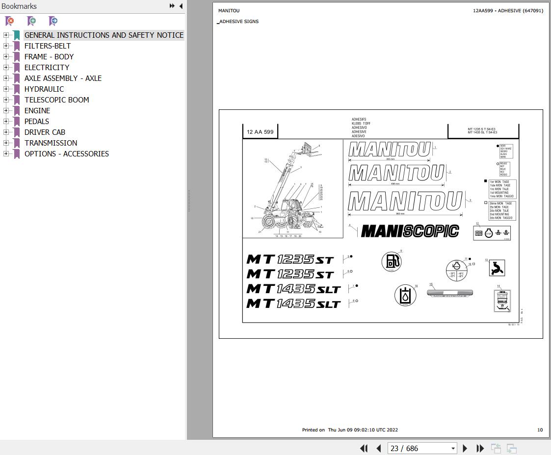 The Bookmarks Of Manitou MT 1235 S TURBO S4 E3 Telescopic Handler Parts Catalog: