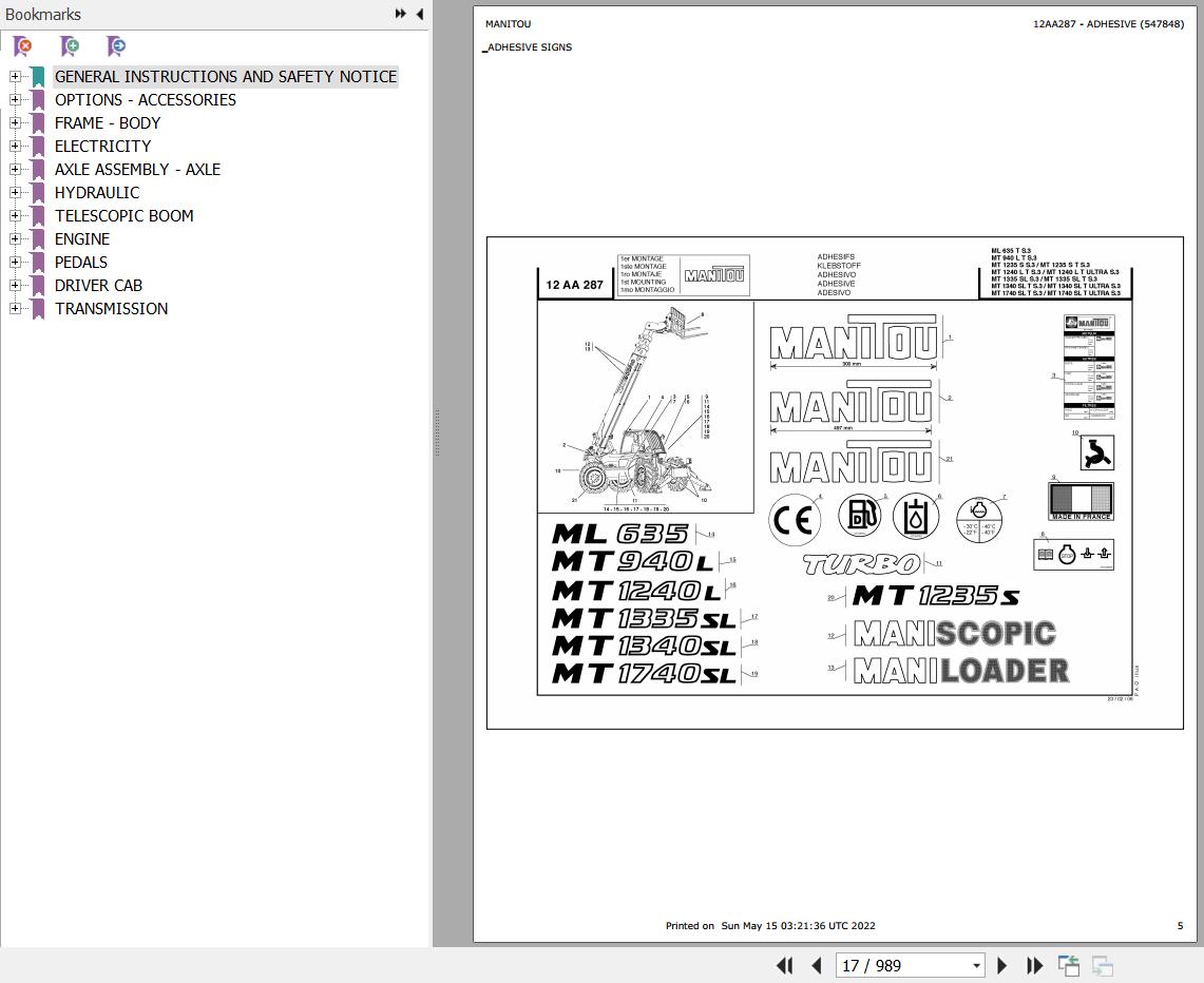 The Bookmarks Of Manitou MT 1335 SL TURBO S3 E2 Telescopic Handler Parts Catalog:
