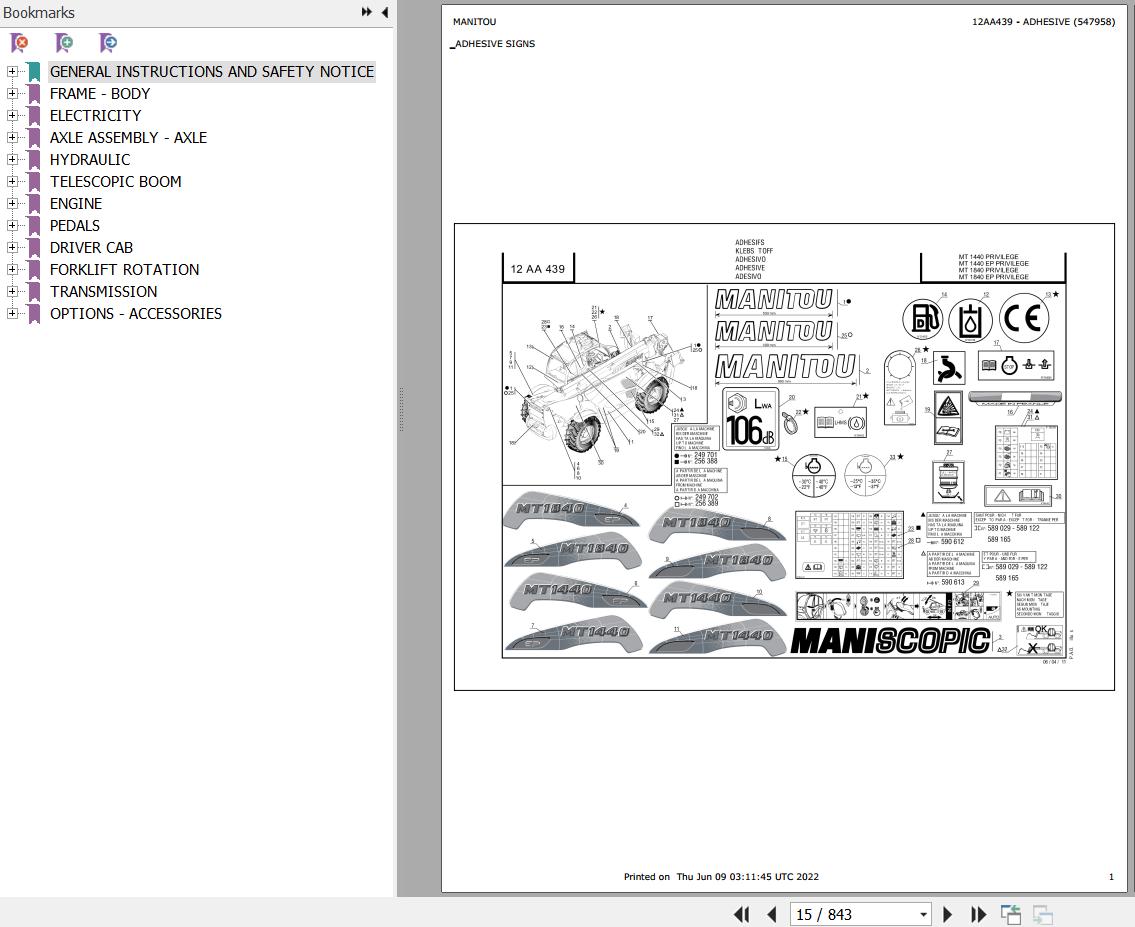 The Bookmarks Of Manitou MT 1440 PRIVILEGE Telescopic Handler Parts Catalog: