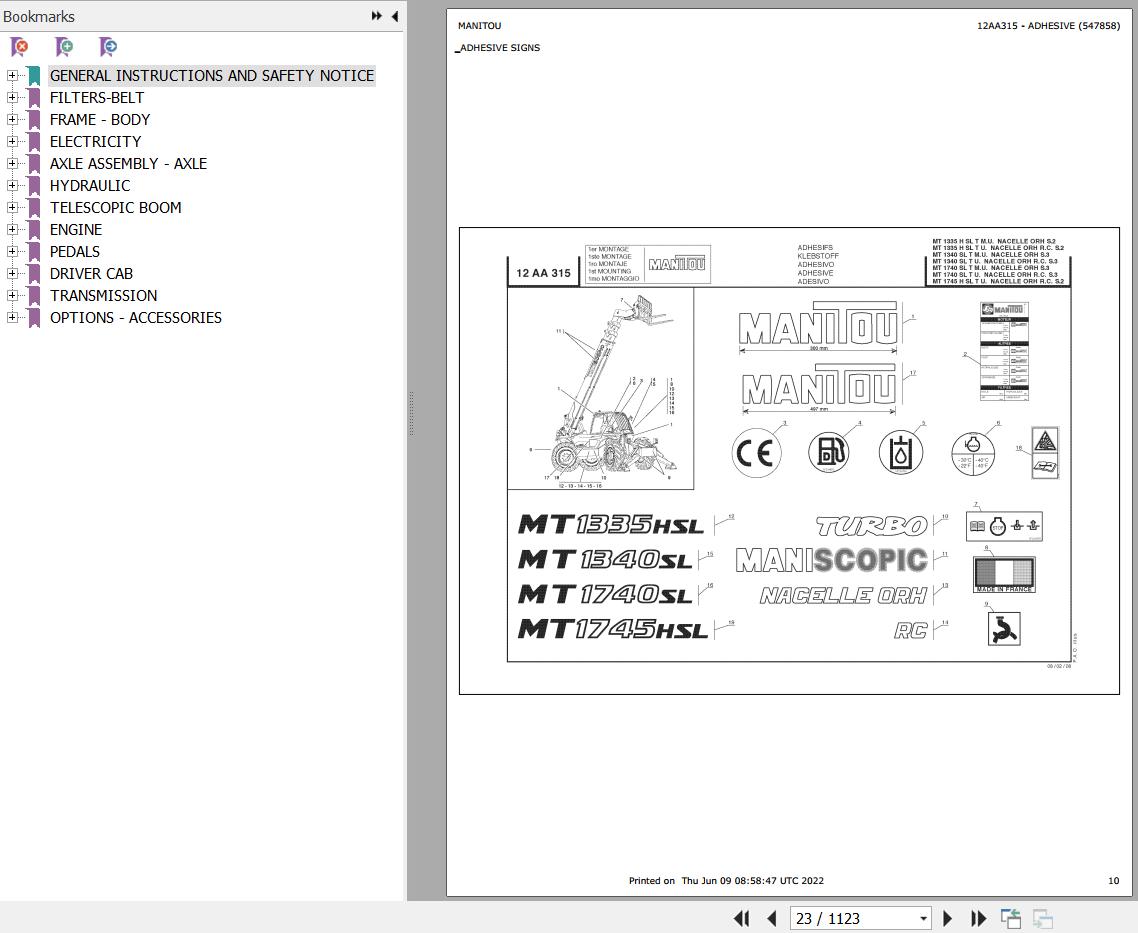 The Bookmarks Of Manitou MT 1740 SL TURBO ULTRA ORH RC S3 E2 Telescopic Handler Parts Catalog: