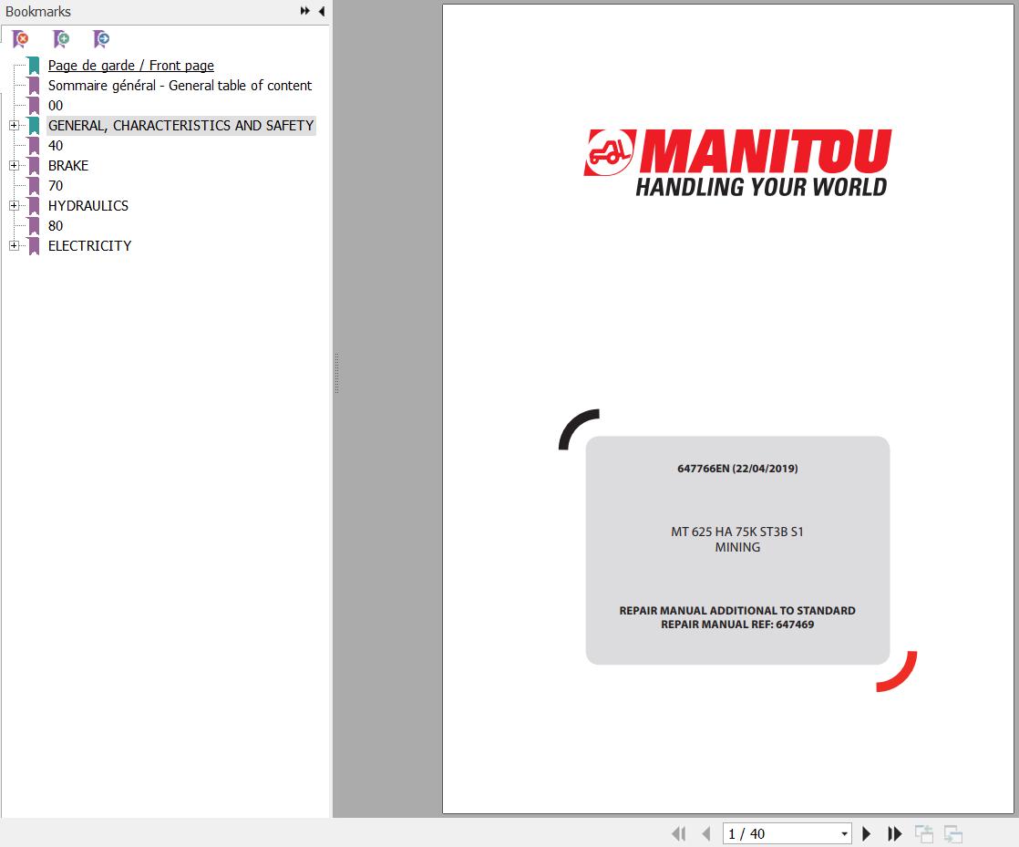 The Bookmarks Of Manitou MT 625 HA 75K ST3B S1 MINING Telescopic Handler Repair Manual: