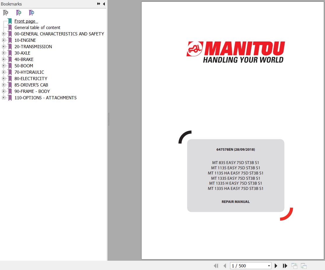 The Bookmarks Of Manitou MT 835 MT 1135 MT 1135HA MT 1335 MT 1335H MT 1335HA EASY 75D ST3B S1 Telescopic Handler Repair Manual: