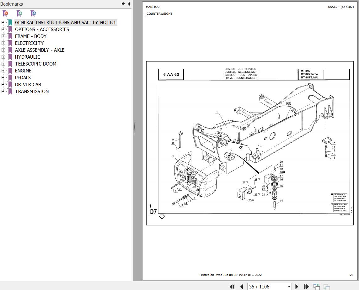 The Bookmarks Of Manitou MT 845 Telescopic Handler Parts Catalog: