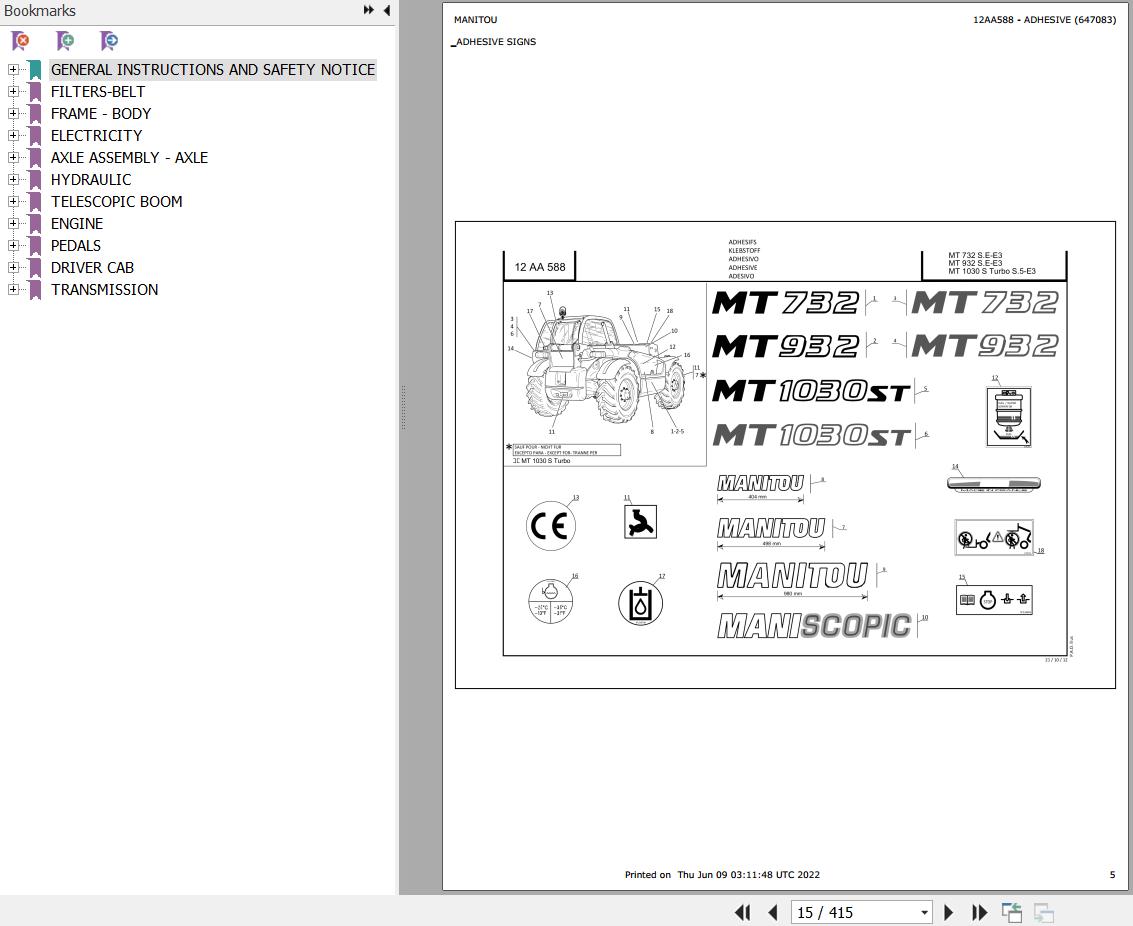 The Bookmarks Of Manitou MT 932 SE E3 Telescopic Handler Parts Catalog: