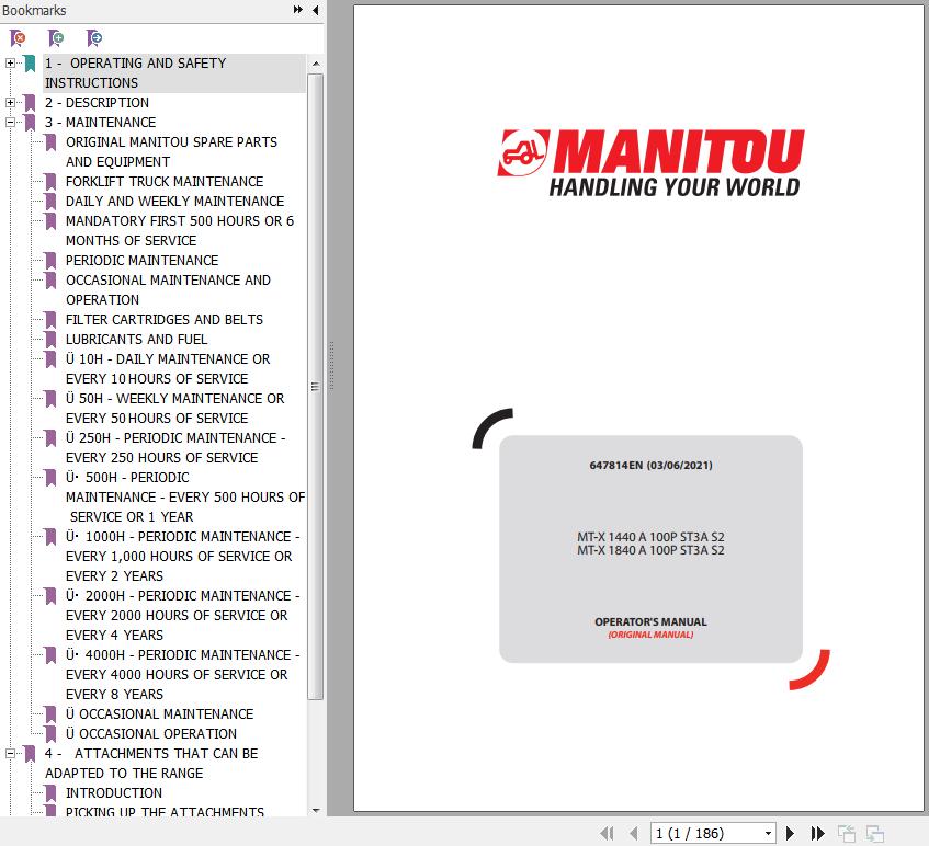 The Bookmarks of Manitou MT-X 1440A 100P ST3A S2 MT-X 1840A 100P ST3A S2 Telescopic Handlers Operator's Manual: