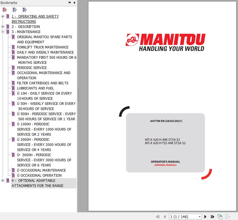 The Bookmarks of Manitou MT-X 420 H 49K ST3A S2 MT-X 420 H TSS 49K ST3A S2 Telescopic Handlers Operator's Manual: