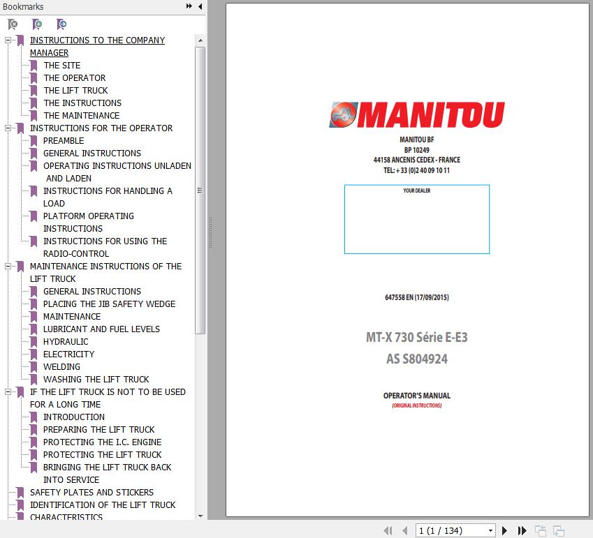 The Bookmarks of Manitou MT-X 730 Series E-E3 ASS804924 Telescopic Handlers Operator's Manual: